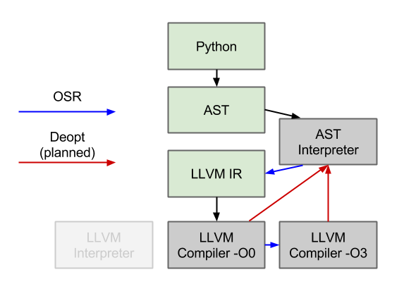 Currently, though, the new AST interpreter is slower to execute than the LLVM interpreter — which was surprising to me, since the LLVM IR is quite low level and not designed for interpretation. The LLVM interpreter does have a few advantages, though: 1) it happens after (very simple) type specialization, which means that it is able to elide dynamic dispatches, and 2) the pointer-based SSA in the LLVM IR is faster to manipulate than the string-based Python AST.